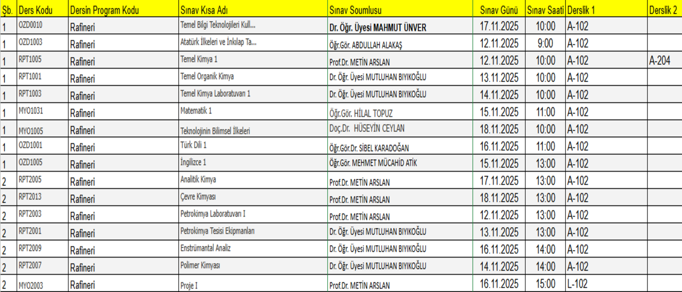 Rafineri ve Petro-Kimya Teknolojisi Programı 2025-2026 Güz Dönemi Vize Sınav Programı